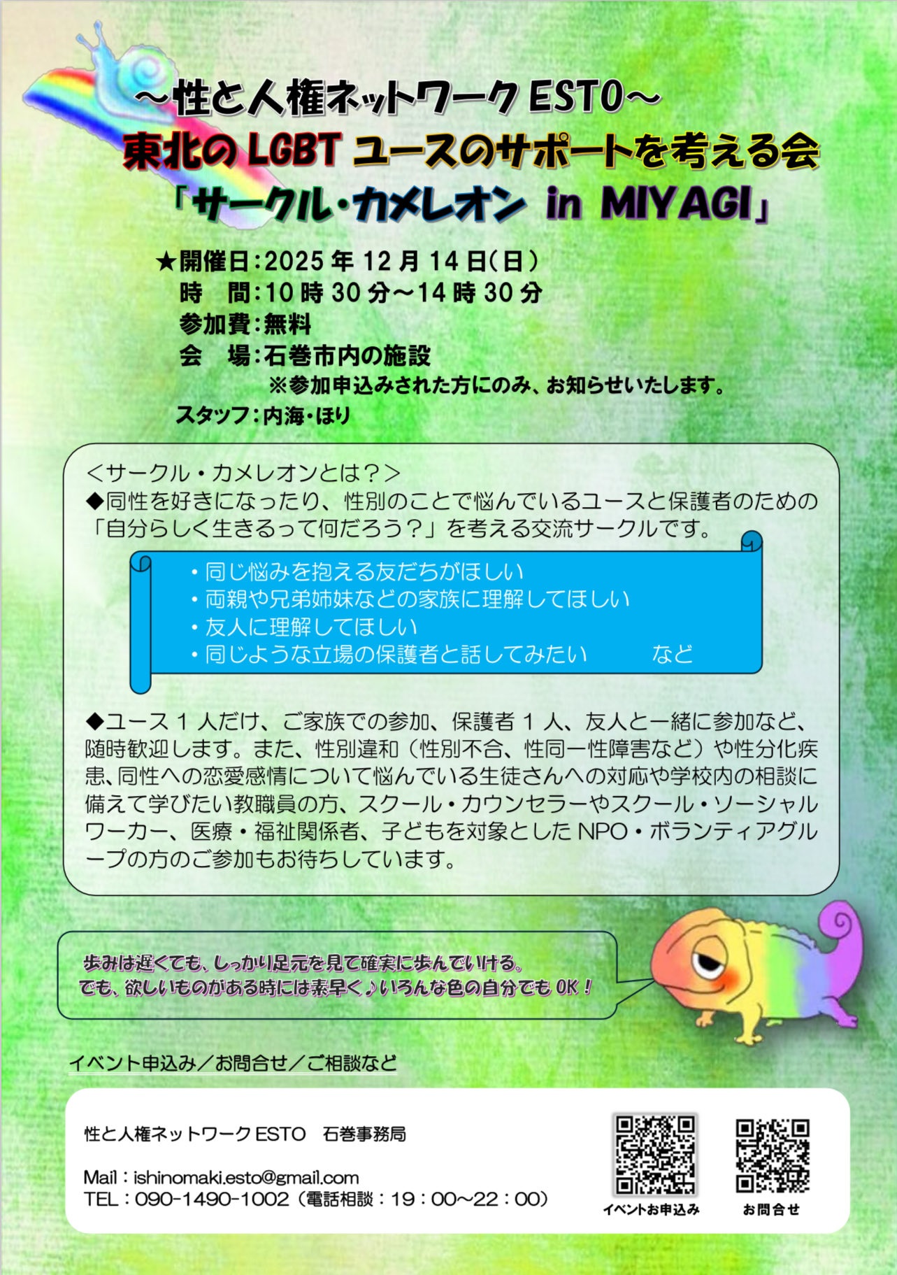 同性を好きになったり、性別のことで悩んでいるユースと保護者のための「自分らしく生きるって何だろう?」を考える交流サークルです。「性的マイノリティの児童・生徒にサポートを届けること-」を目的に、年代や性別を問わず、お気軽に参加できる場として開催しています。